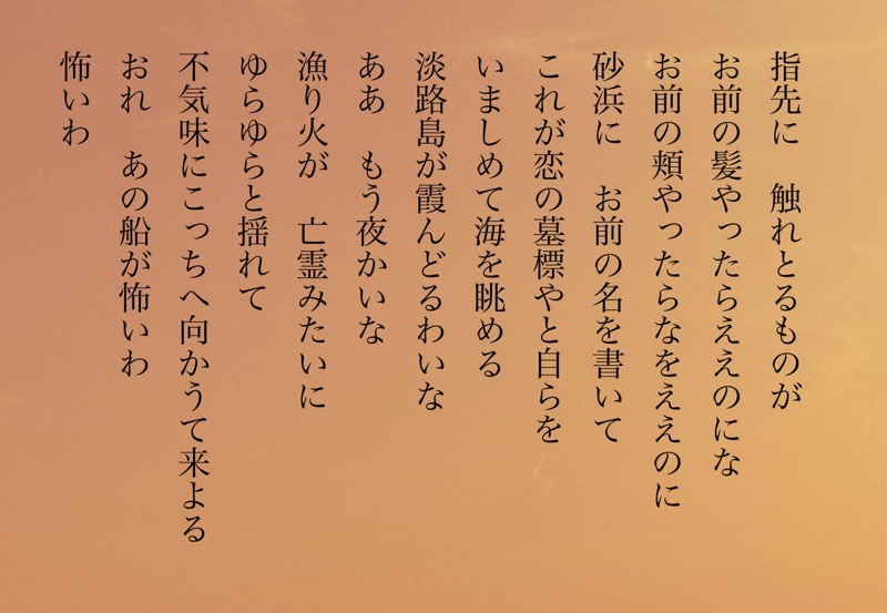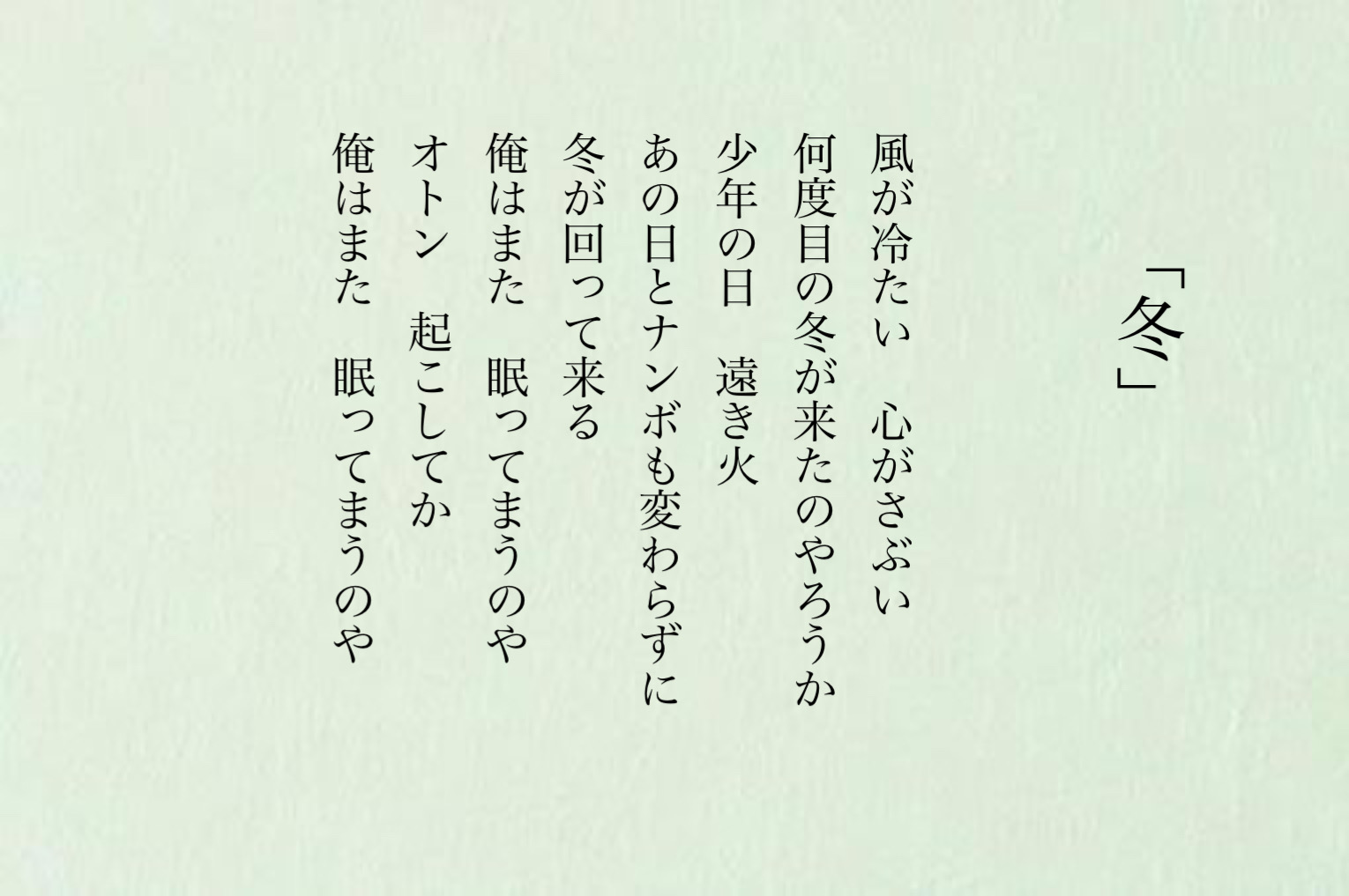 友人が泊まりに来ていた。とても変わった人なので、突然家に来て特に世間話をすることもなく、同じ空間、瞬間に偶然存在していたかのような距離感でスマホを見ていた。こっそり覗いてみると、このホームページの日記を開いていた。彼なりに、俺との世界を繋げようとしていたのかも知れない。けれども、どことなく彼の大きく逞しい背中に影が落ちているの感じた。それは、この部屋の照明が暗いためか、それとも、何か背負ってしまったのか・・・。以前、彼に貸した戦争中の戦記小説を返却されたので、感想を訊ねる。これはあの時代に書かれたものであるから、今とは全く異なる捉え方で読むことが出来た。案外それも真実なのかも知れない。そのような感想を話してくれた。俺は思わず、「そうや」とこぼした。そうなんや。戦争は絶対悪であることが前提で、それでもそれぞれ、一生懸命やった。このことは哀れに思われるべきで、感謝や賞賛にしてはいけないと俺は思っている。矛盾しているのだ。それほど複雑で一つの思想では語れない。考えている間に夜も深くなった。先ほど淹れたアイスコーヒーの氷も溶けきり、なんぼか飲み易くなっていた。時間が濃さを薄めてゆく。赤い布団に潜り込み、友の横顔を見つめる。俺たち二人がこの時代、この時に出逢った不思議を感じる。なんだか前にもこの光景を見ている気がする。